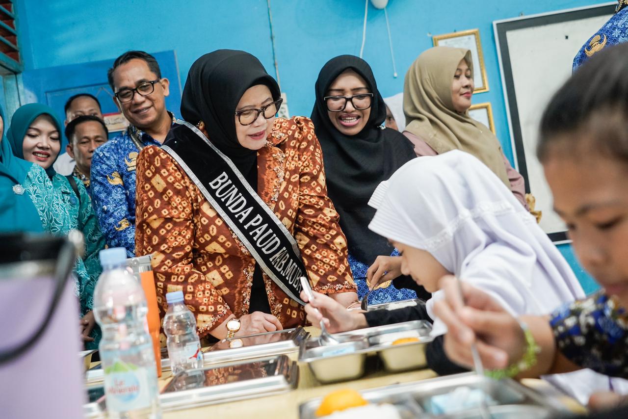 Saat melakukan peninjauan, Bunda PAUD Kabupaten Muba Hj Patimah Toha, berinteraksi langsung dengan anak-anak penerima manfaat dan mengamati proses penyajian dan konsumsi makanan bergizi.